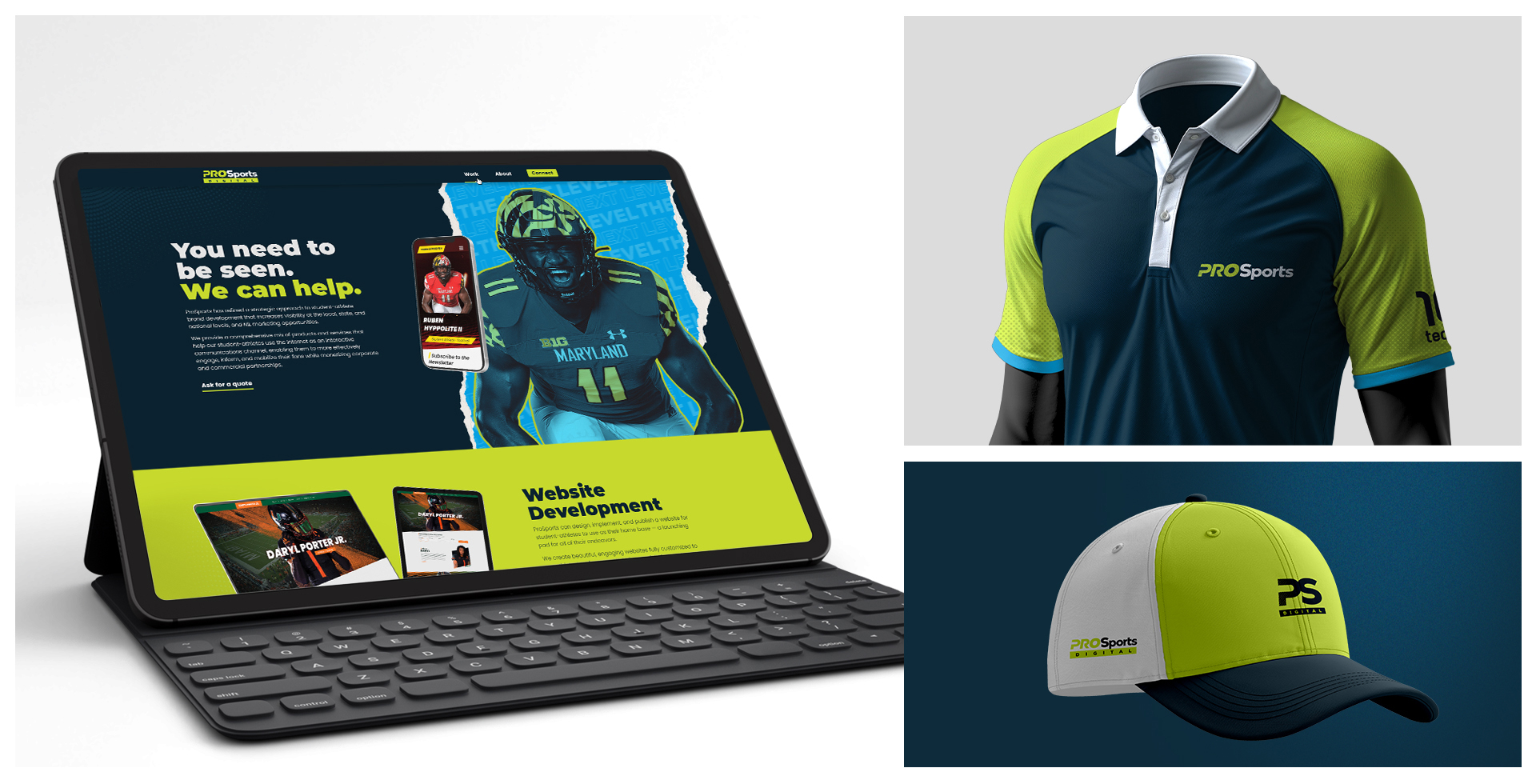 For ProSports Digital, an agency focused on advancing the careers of college football stars, I delivered the full brand identity. This comprehensive project included logo creation, a high-impact visual universe, and complete website design. The identity, which was also applied to merchandise like t-shirts and caps, positioned the agency with a dynamic, professional image to attract and serve the next generation of athletes.
