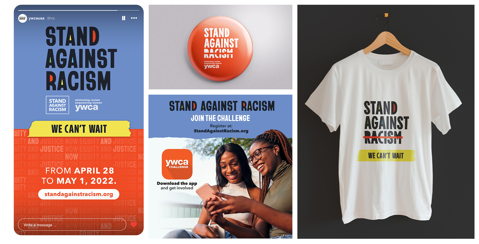 The design strategy for the Stand Against Racism campaign for YWCA USA focused on visual power to drive immediate action. The logo and distinctive visual universe were crafted to cut through the noise, using bold graphics and evocative imagery for strong storytelling. This identity was applied seamlessly across all media, including social posts, t-shirts, and pins, empowering the message: equity and justice now.